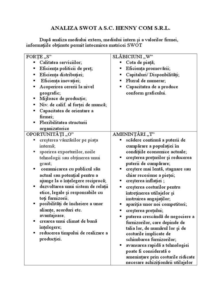 Analiza swot a companiei s c. Probleme de urmarit in analiza firmei 6 2 2. Metode de succes in marketingul utilizat de firma kdent 12 3 4. Președintele comisiei prezidențiale pentru politici publice de dezvoltare a agriculturii valeriu steriu a făcut în exclusivitate pentru agrointel o analiza swot puncte tari puncte slabe oportunități amenințări a agriculturii românești.