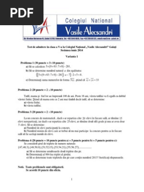 Test De Admitere In Clasa A V A La Colegiul Naţional Vasile