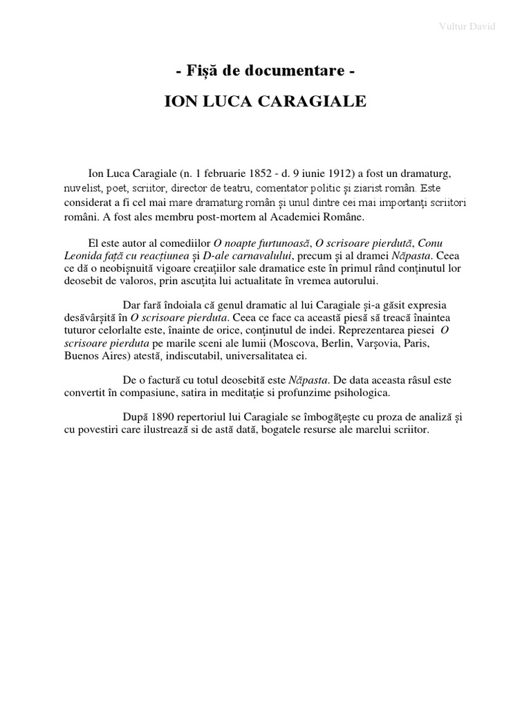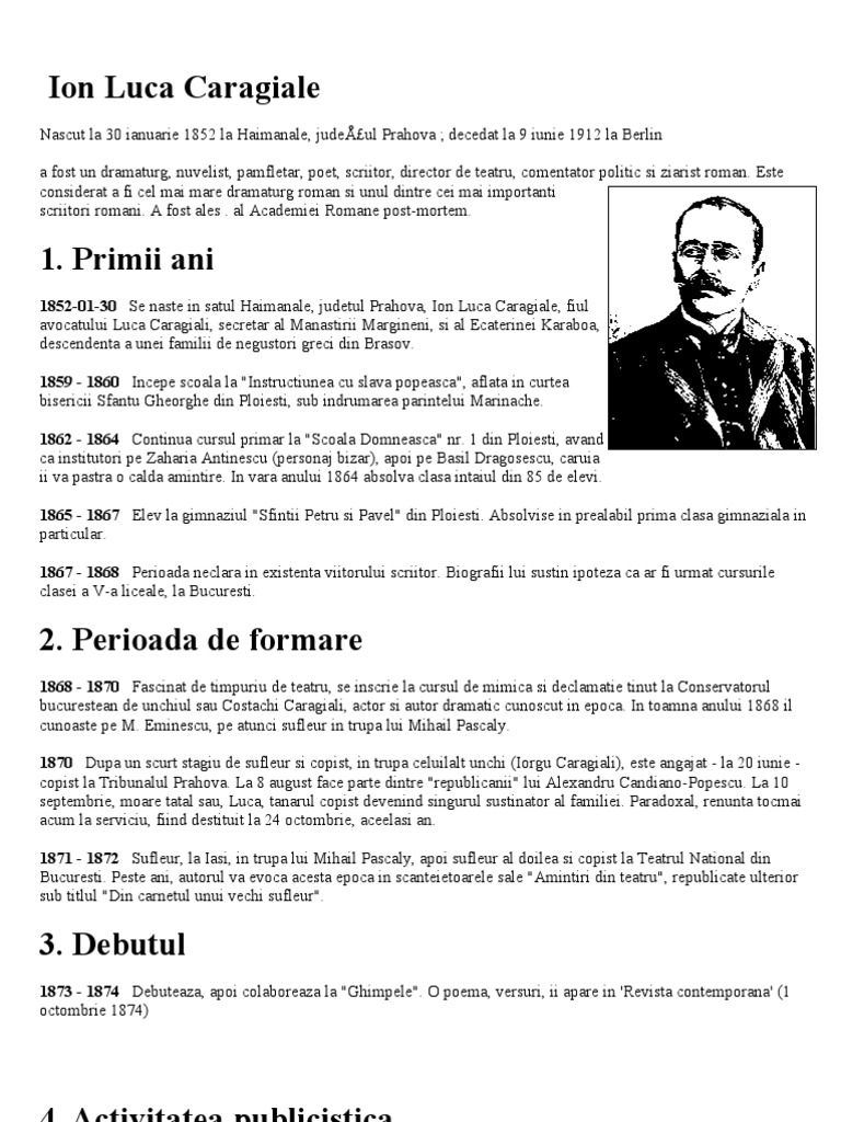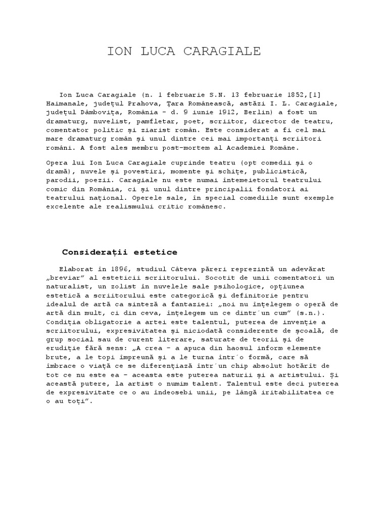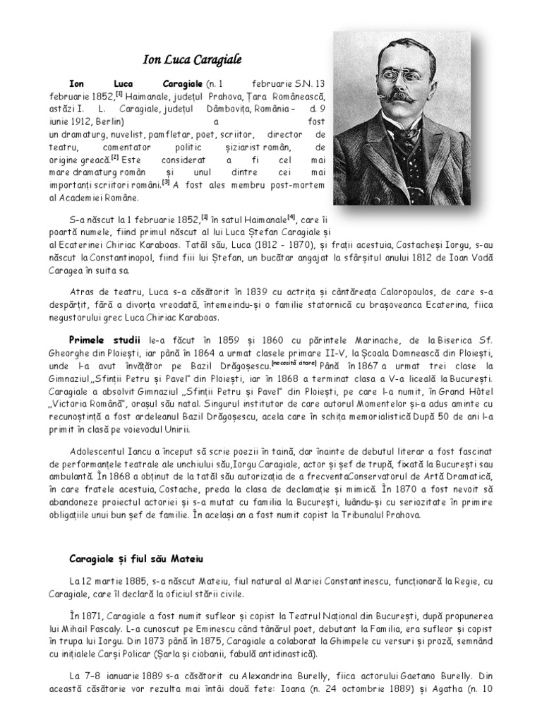 învăţământ primar limba şi literatura român ă. Autorul a învățat în perioada 1859 1860 la biserica sfântul gheorghe din ploiești iar dascăl i a fost părintele marinache. Biografia dramaturgului roman ion luca caragiale 1852 1912. Este considerat a fi cel mai mare dramaturg român și unul dintre cei mai importanți scriitori români.