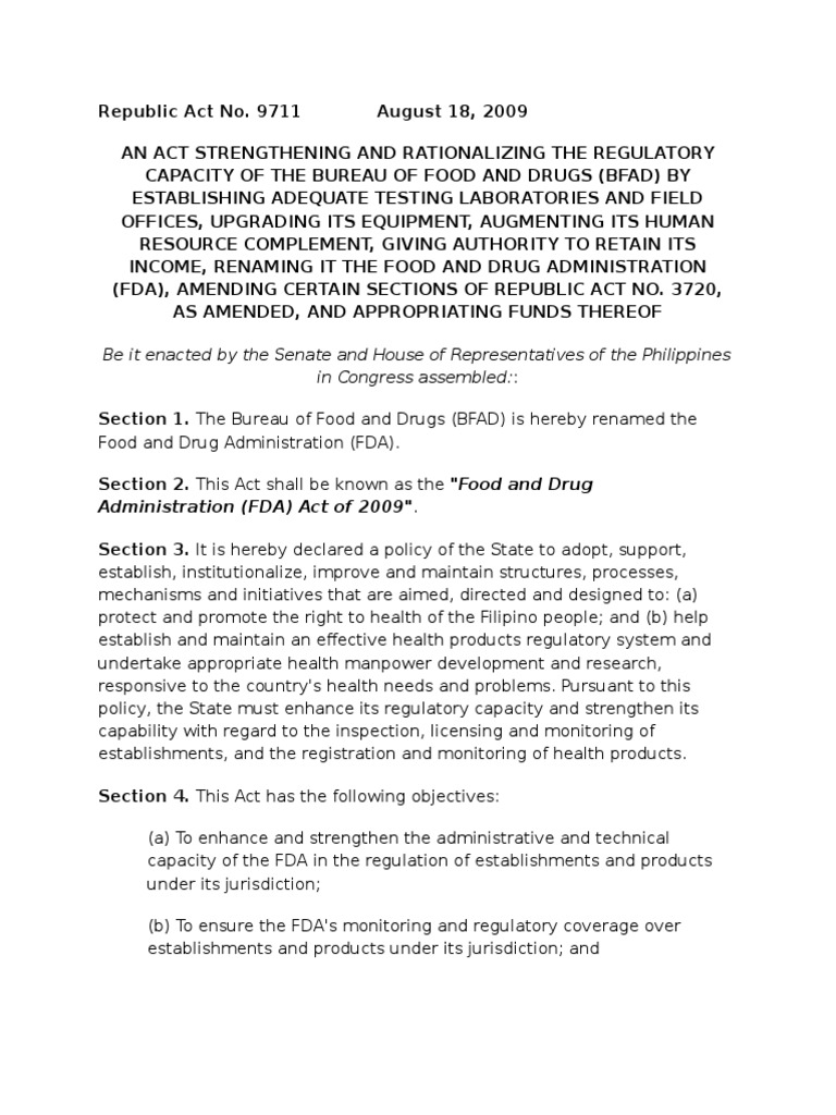 Republic Act No 9711 The Food And Drug Administration Act Of 2009