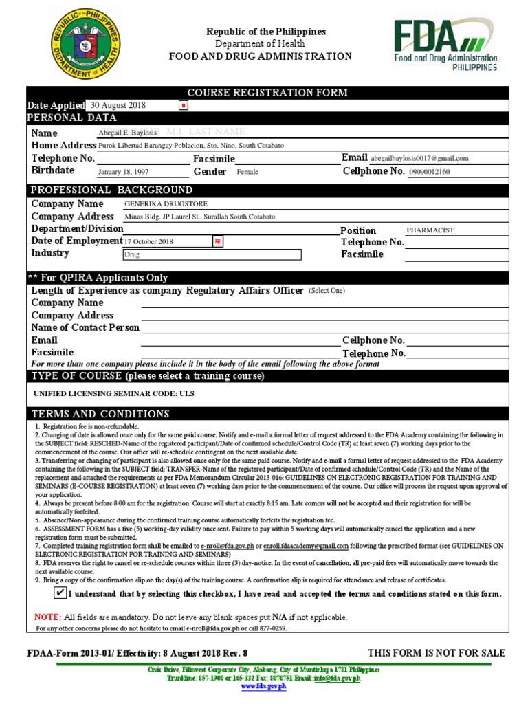 Courseregistration Form Food And Drug Administration Government