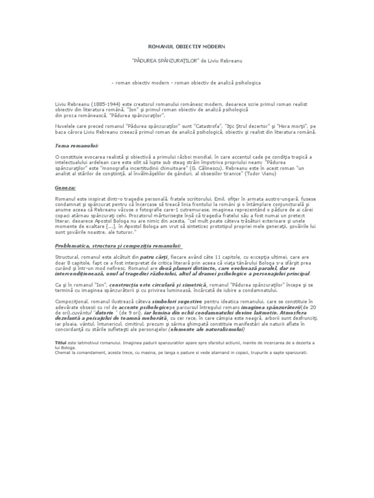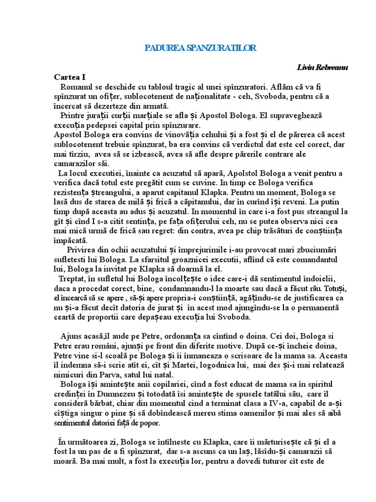 Pădurea Spanzuraţilor De Liviu Rebreanu Rezumat Si Comentariu