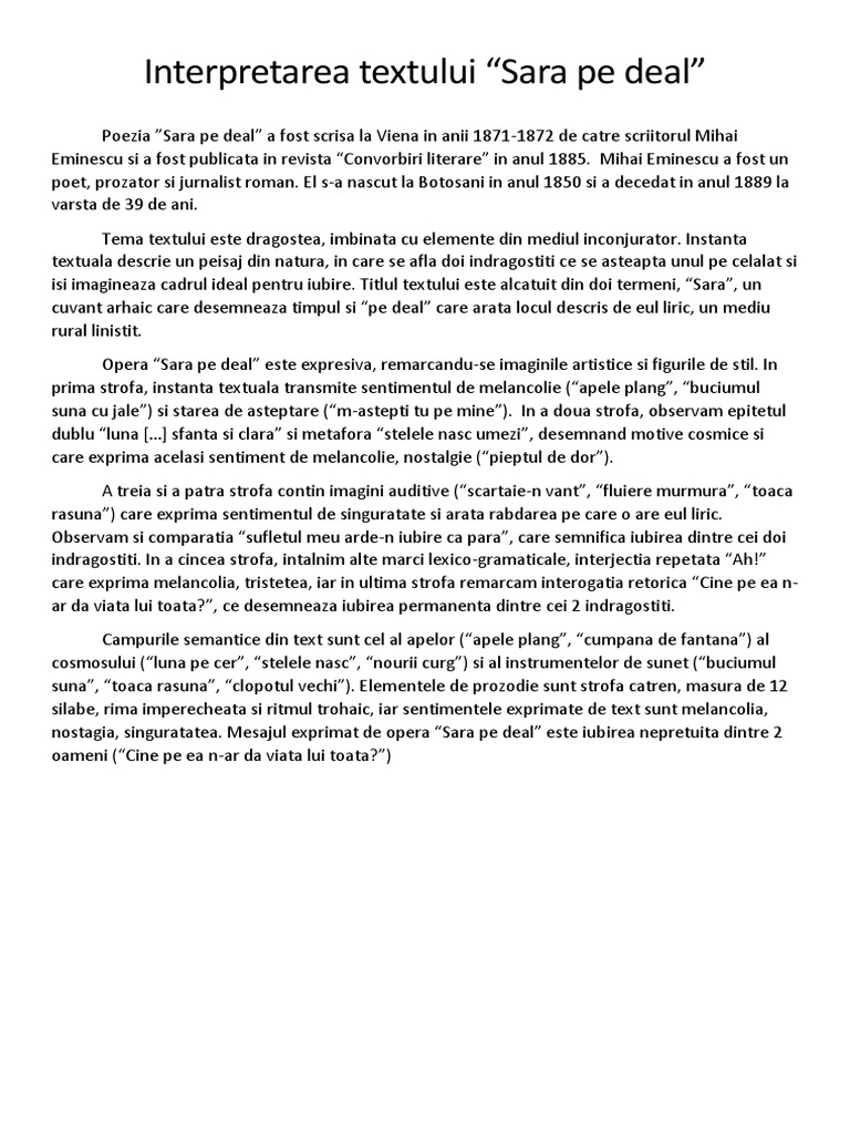Interpretarea Textului Sara Pe Deal