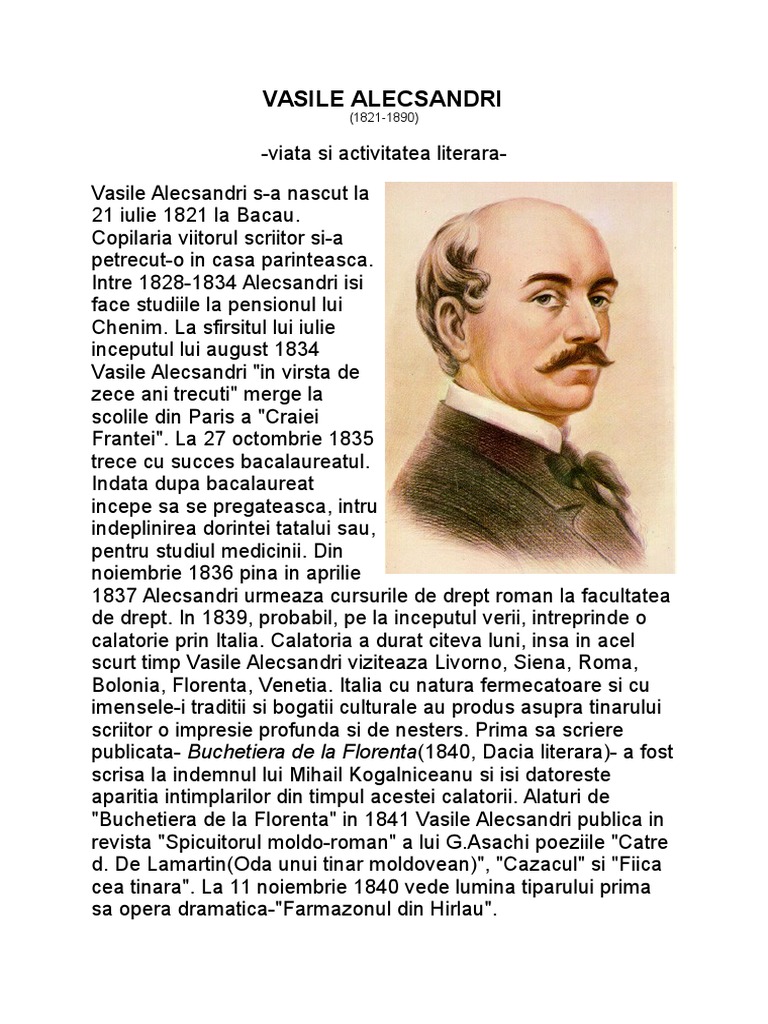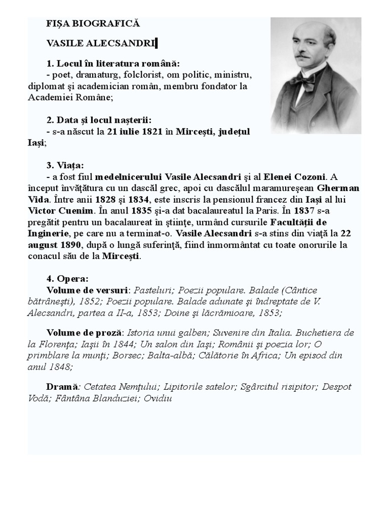 July 21 1821 august 22 1890 was a moldavian poet playwright politician and diplomat he collected romanian folk songs and was one of the principal animators of the 19th century movement for romanian cultural identity and union of moldavia and wallachia. 21 iulie 1821 bacău d. Mircea eliade fisa biografica. Salvare salvați fisa biografica vasile alecsandri pentru mai târziu.